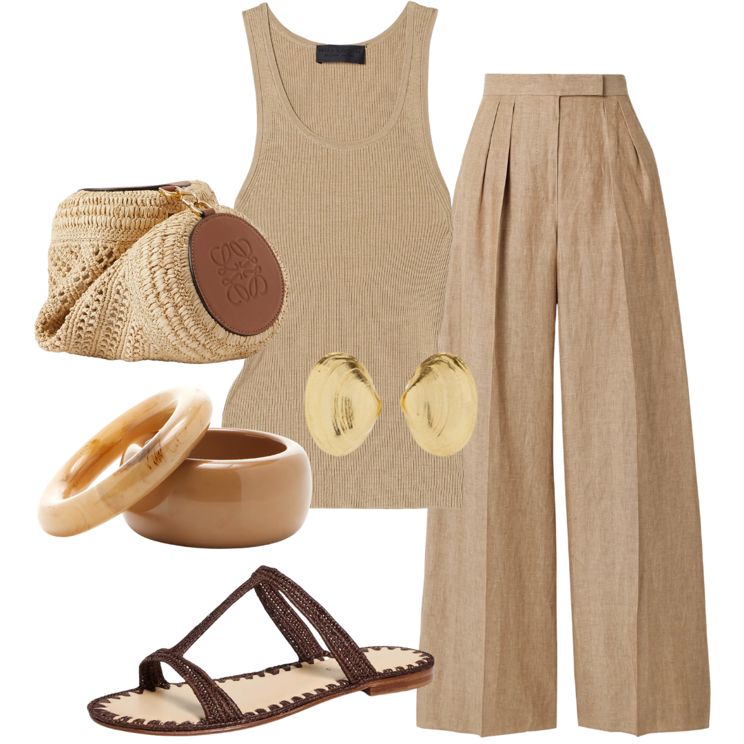 Whenever I don’t know what to wear, I gather everything in the same color palate and it always finds a way to somehow work. Start with a family of textures, in this case I gravitated towards natural fibers like linen and raffia, and then add in a pop of gold to brighten it up.