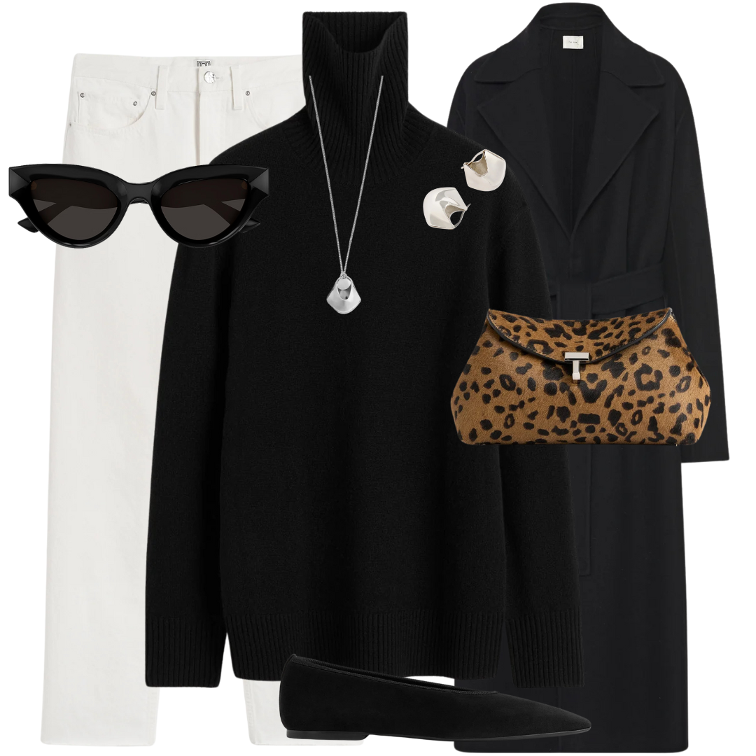 The irony of winter white? It looks great with black. A minimal all black look, but add a twist with a fun accessory like this leopard print clutch. The best part about wardrobe staples, like a great black coat or the perfect fitting winter white denim is that it makes outfit formulas easy and effortless.