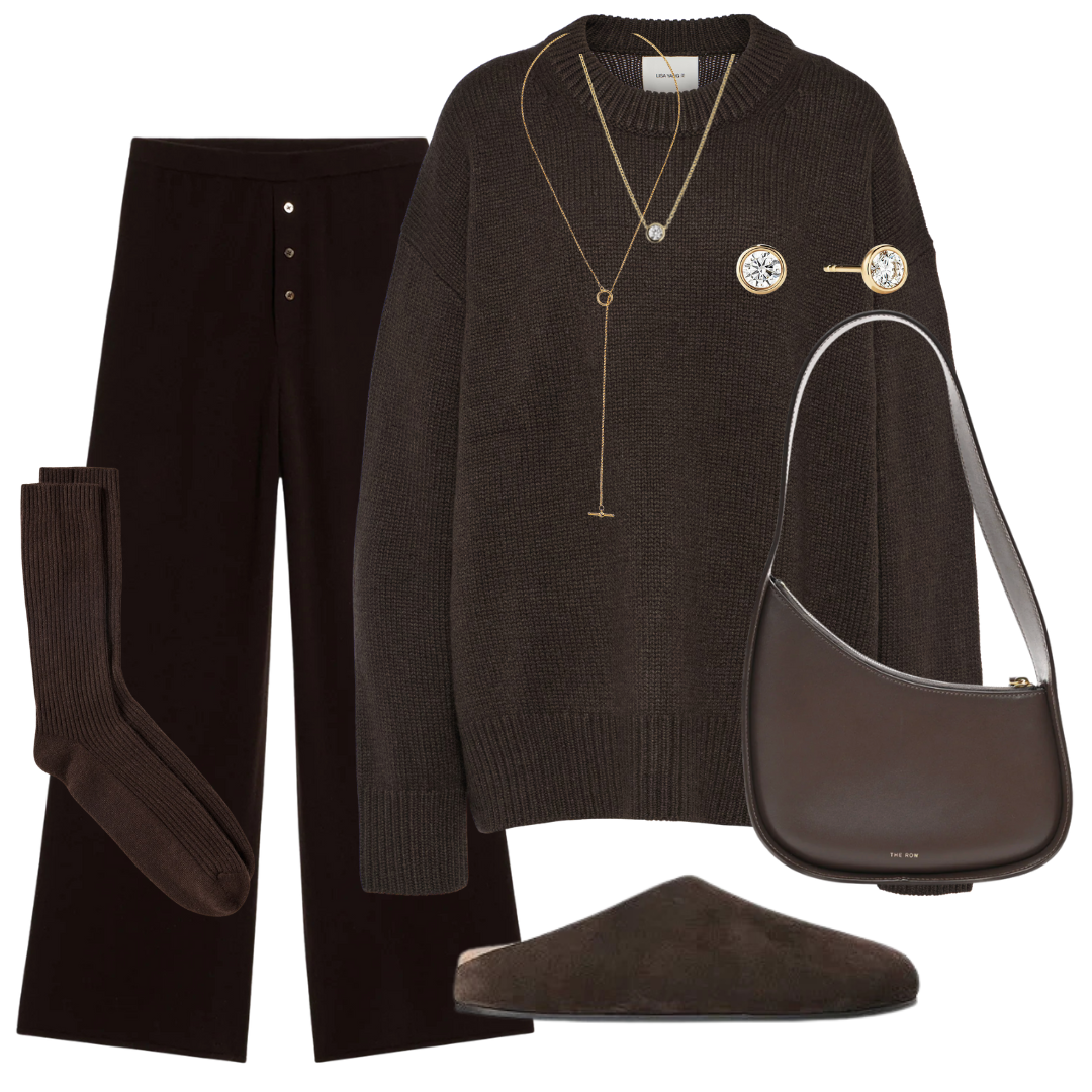 The ultimate weekend look, all in cashmere. A slide with a cashmere sock helps lean the look trendy, but there is something completely classic and chic about monochrome cashmere. Layer necklaces to elevate it just enough to run errands or head to brunch with friends.