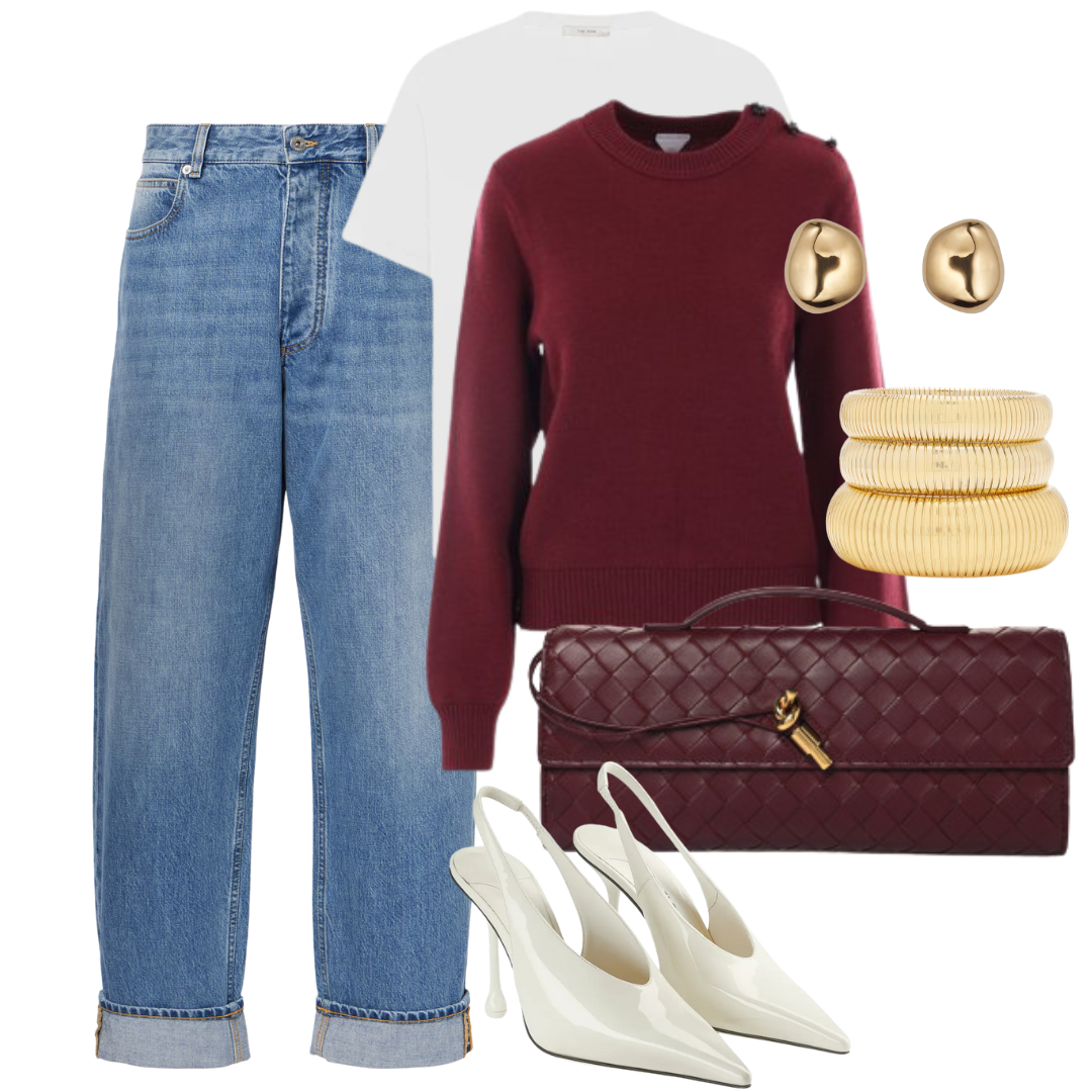 The kind of outfit I’ll wear on repeat that’s easy to go from day to night. Layered sweater, oversized jeans and a heel can easily be swapped out for flats during the day. This burgundy / oxblood color feels luxe and pairs beautifully with gold accessories.