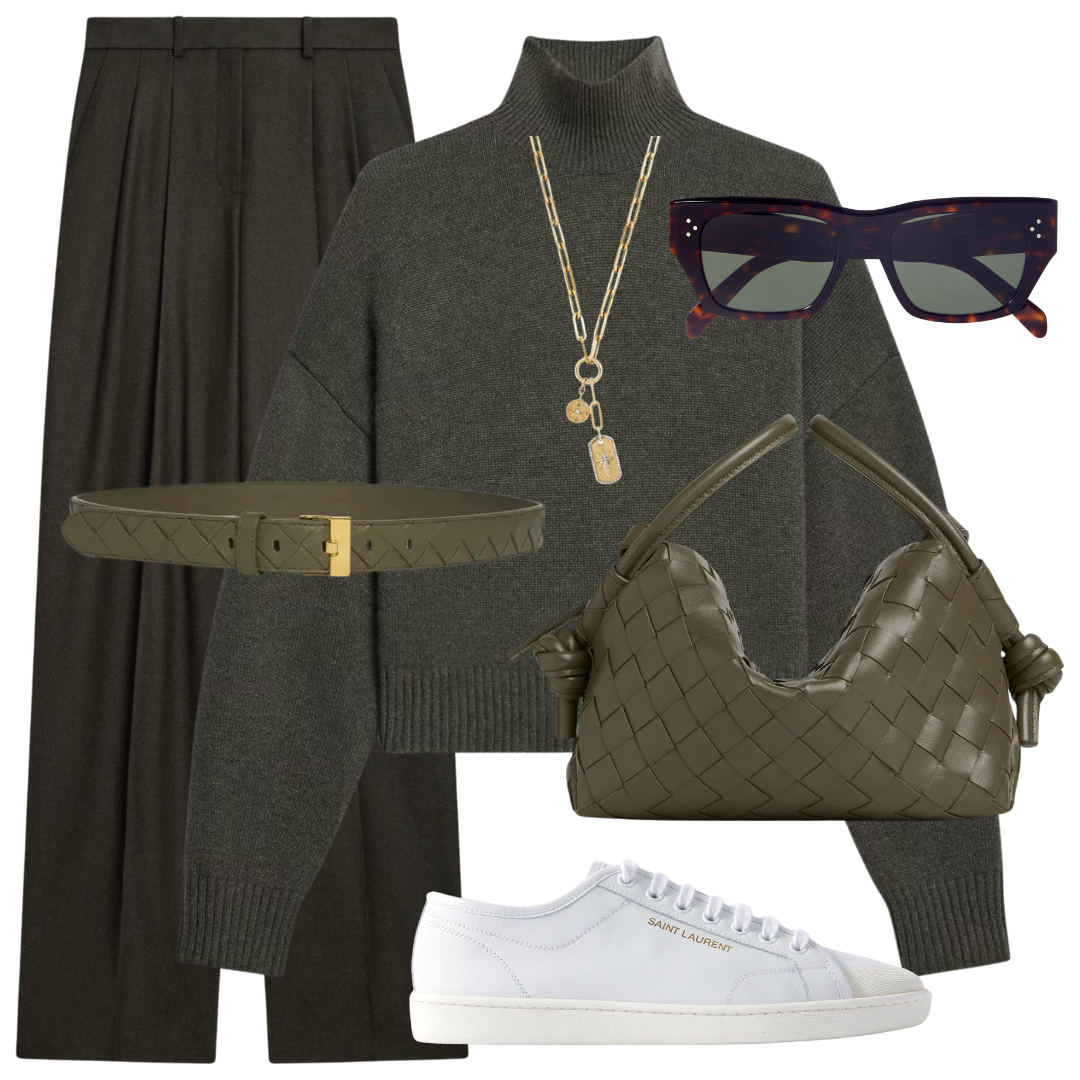 Those who know me well know that I am always into a monochrome color story, and it usually starts with one piece to build an outfit around. In this case, the perfect chunky turtleneck perfect for when you don’t want to wear a jacket this time of year. I love pairing sneakers with trousers, and added some femininity with pops of gold accessories.