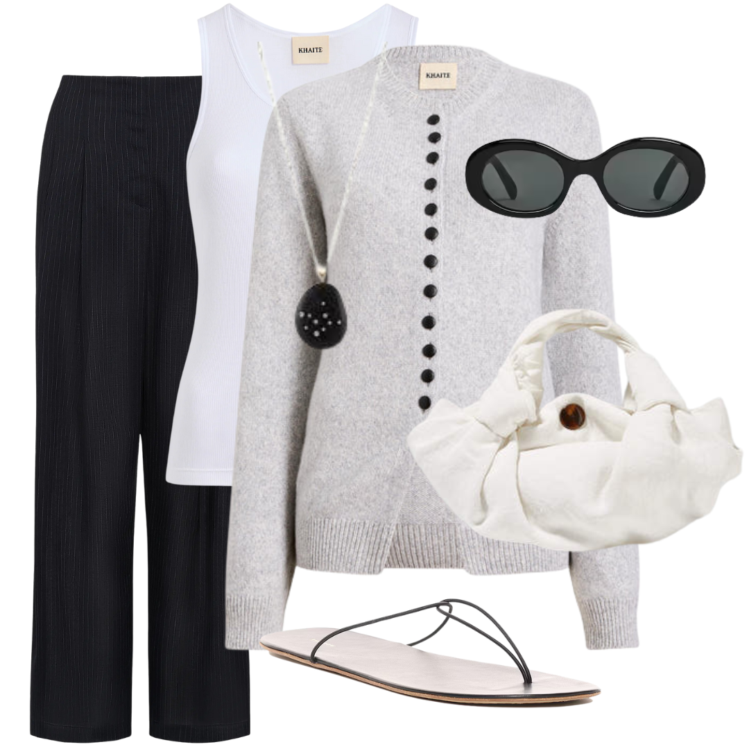 Elevated everyday dressing — a mix of that quiet luxury we love (enter: TWP Pinstripe Pants) but dressed down with a super minimal sandal. These Khaite basics are catching my eye, but could be recreated with any white tank and grey cardigan (keep it structured). This is the kind of transitional Fall look I love - and can be built easily through a Fall capsule wardrobe.