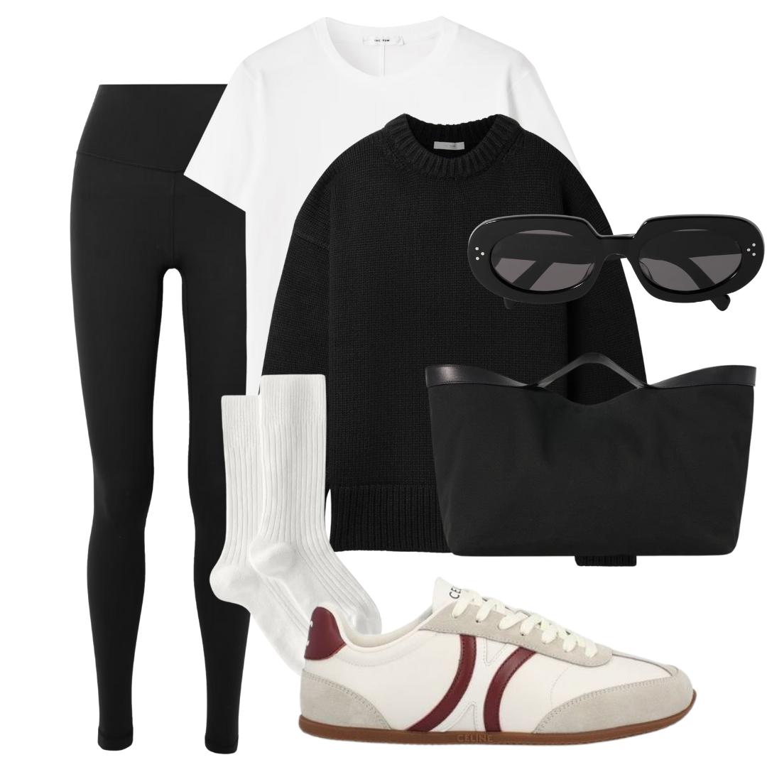Airport style is easy to accomplish with layers and lots of black. I abide by a strict no jeans rule on airplanes (and long car rides) - so the perfect black leggings are crucial. A fun sneaker can make things pop too.